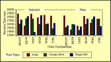 As predicted, significant main effects and interactions were found for font type, word style, and color combination. For example, plain text is consistently responded to more quickly than italicized. These main effects suggest that one can make general recommendations to screen display designers. However, the significant interactions highlight the fact that there is no one color combination, font type, or word style to use, but rather all conditions affect one another. In Figure 2, compare the results of Arial/italicized to Arial/plain. Notice how within each of the gray combinations, the results "flip-flop" between italicized and plain. This type of interaction was true of other variable combinations across conditions, which means a designer must consider a variable's influence on all other variables. This interaction of variables is not mentioned in current manuals; hopefully, future manuals will address such interactions.