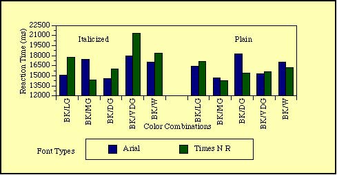 Surprisingly, black on medium gray (x=15215.21) and black on dark gray (x=16088.70) had significantly faster RT's than black on white (x=17176.3; F (4,80)=3.37, p<.01). Plain word style (x=16052.53) was still significantly faster than italicized (x=17025.69; F (1,20)=5.22, p<.03), and unlike before, there was no significant difference between the two fonts. There were significant two-way interactions between color combinations and font types (F(4,80)=2.46, p<.05). Times NR had more variability across color combinations than did Arial font type. The medium gray/Times NR combination had the fastest RT (x= 14350.80), yet very dark gray/Times NR had the slowest RT (x=18505.95). There were also significant interactions between color combinations and word styles (F(4,80) =3.06, p<.02). Very dark gray/italicized had the slowest RT (x=19647.46), and medium gray/plain (x=14497.40), and dark gray/italicized (x=15347.57) has the fastest RT's.