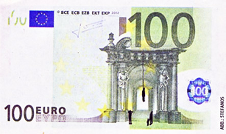 So macht es der griechische Künstler »Stefanos« mit schwarzer Tinte. Die Banknoten seien, wie die EU selbst, reine Einrichtungen, in/auf denen keine Menschen erscheinen, die aber das Leben von Millionen bestimmen.
