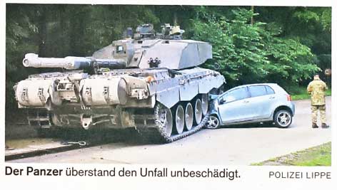 Erstaunliches erfahren wir aus dem Flensburger Tageblatt. Unter der Überschrift »Fahranfängerin übersieht Panzer« gibt es ein Foto mit einer sensationellen Bildzeile: